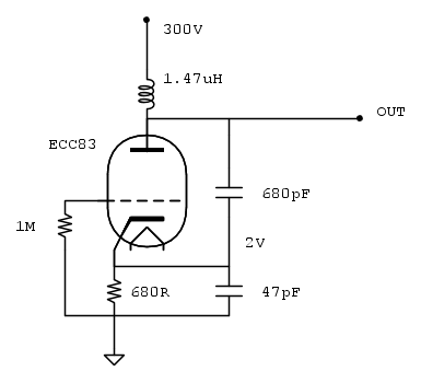 Per ragioni puramente didattiche sto cercando di realizzare un semplice oscillatore con una sezione di un triodo ECC83. Facendo una ricerca in rete ho deciso di affidarmi a una delle tante varianti del circuito Colpitts ed ho quindi realizzato questo schema: