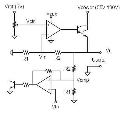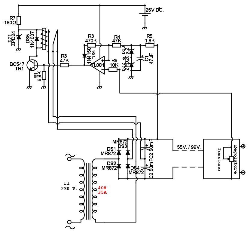 In passato ebbi già modo di realizzare un circuito di commutazione automatica ma si trattò di commutare tensioni di 12V e 25V DC. In quel caso realizzai lo schema che ripropongo di seguito, sia pur con qualche modifica, ma giusto per documentare la necessità attuale di funzionamento. In pratica dovrei commutare una tensione di 55V DC e una di 99V DC. ma lo schema pubblicato è stato realizzato a mero titolo esemplificativo e senza averlo mai provato in questa occasione. Il TL081 non potrebbe gestire tensioni così elevate. Dunque, non potendo utilizzare questo operazionale (così mi sembra) esiste un’alternativa che abbia un po’ di isteresi per commutare tensioni in continua così elevate ? Non ho trovato precedenti sia sul Forum sia su Google.