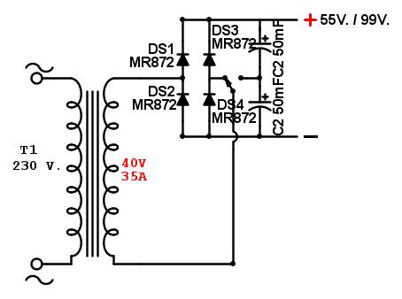 avrei la necessità di commutare automaticamente 2 tensioni in DC ma si tratta di tensioni elevate; per iniziare, pubblico di seguito lo schema del trasformatore, raddrizzatore, duplicatore e filtro per commutazione manuale.