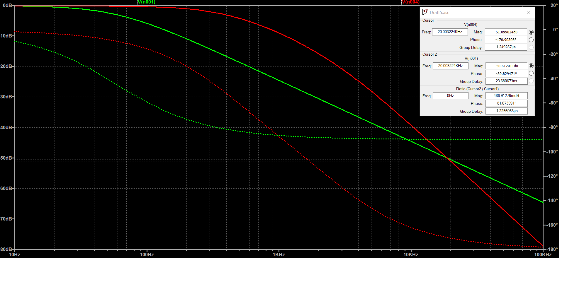 In verde la risposta del filtro del primo ordine, in rosso quella del secondo ordine. Si vede che a 20kHz l'attenuazione e` di 50.6dB e 51.1dB, come richiesto. Al variare del parametro k varia l'attenuazione nell'area intorno a qualche kilohertz, ma a 20kHz non si hanno cambiamenti. La banda passante del filtro del primo ordine e` di 61.2Hz, mentre la banda (a -3dB) dei filtri del secondo ordine e` appena superiore a 3kHz.