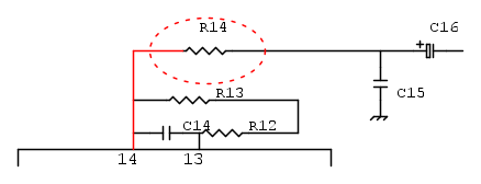 Grazie a tutti per le risposte esaustive. Per quanto concerne la situazione della 1k R14 è vero, dovrebbe andare diretta al pin 14. Magari se provo a togliere la 20k R13 e ponticellare i fori dove essa è attualmente alloggiata e successivamente questa saldarla "volante" collegata all'uscita della 1k R14 e saldando l'altro polo della 20k R13 a quello del C13 da 15nF?