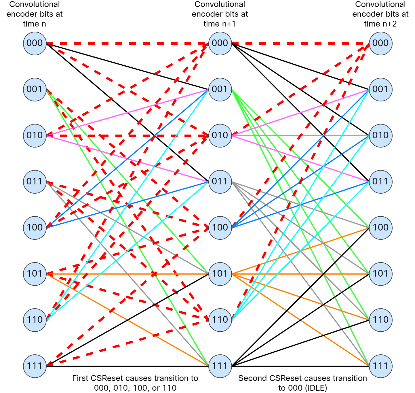 La figura mostra il Trellis (traliccio) di un convolutional encoder TCM ad 8 stati e 2 ingressi binari (gli stati sono indicati nei cerchi celesti).
