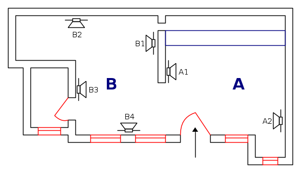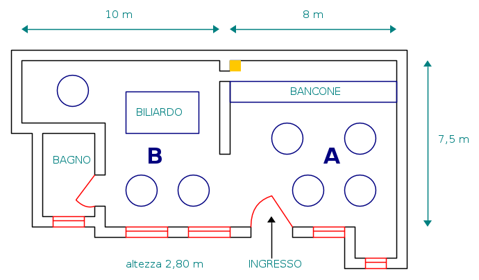 - Posizione amplificatore dietro al bancone (quadrato giallo)