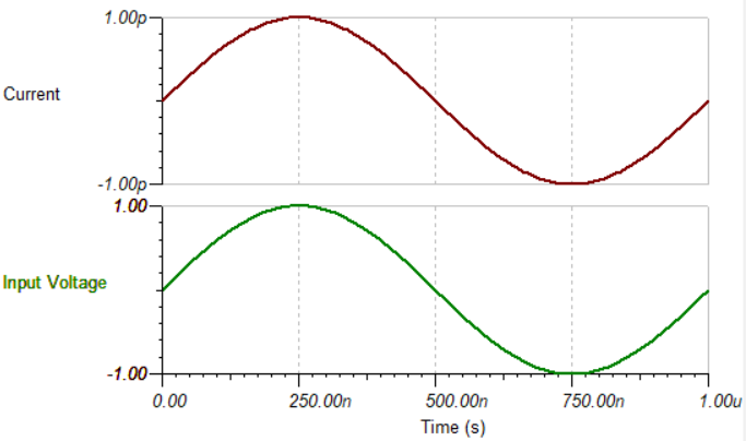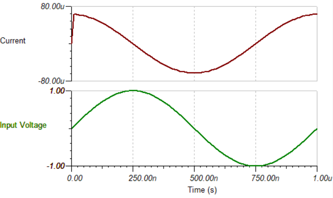 Simulando il subcircuit indicato qui sopra, invece, non si ha alcuno sfasamento.