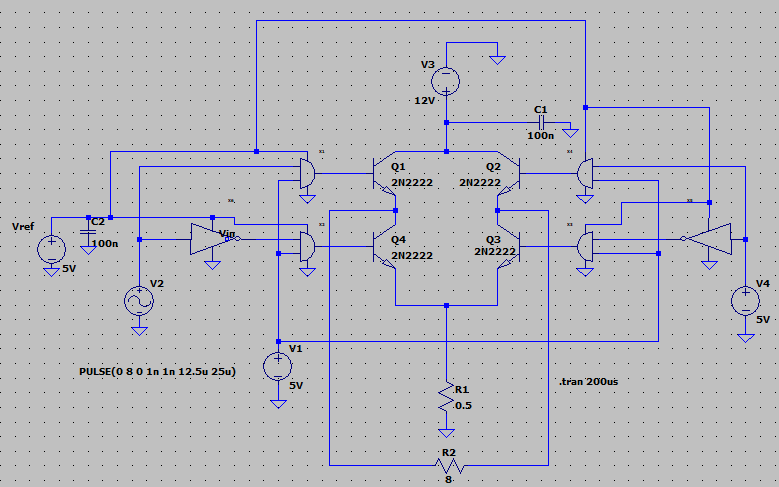 Ciao ragazzi, sono alle prese con un problema riguardante l298, un integrato che supporta due ponti H. Da com'è configurato, dallo schema fornito da ST, ho pensato di utilizzarlo come amplificatore di classe B che ha come uscita un altoparlante. Ho voluto riprodurre il funzionamento su LTSpice ma non rispecchia l'uscita che ho trovato sull'oscilloscopio, di fatto, l'uscita che è sul carico non è amplificata. Sapete dirmi dove ho sbagliato?