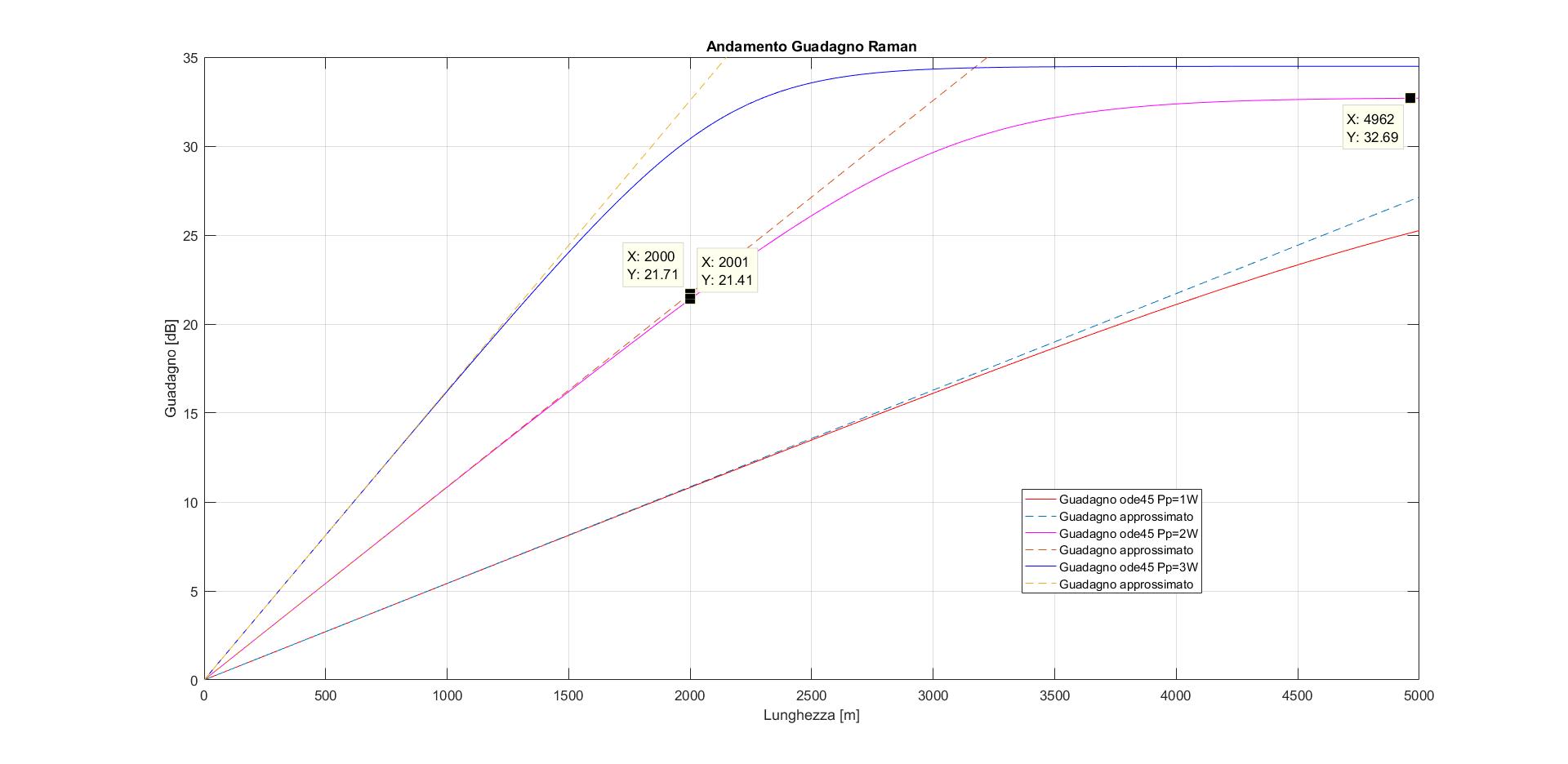 I grafici ottenuti nelle figure in basso descrivono l'andamento del Guadagno Raman applicando un intensità del segnale