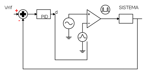 Come si può vedere dallo schema ho un sistema di retroazione dove in ingresso al PID ho l'errore dato dalla differenza tra l'uscita del sistema e il mio segnale di riferimento (una sinusoide). Questo errore va in ingresso al PID dove in uscita avrò un certo valore. Quest'ultimo mi deve andare a modificare la frequenza del segnale triangolare, che poi confrontata con un altro segnale sinusoidale mi darà in uscita una modulazione PWM che controllerà gli interruttori presenti nel sistema.