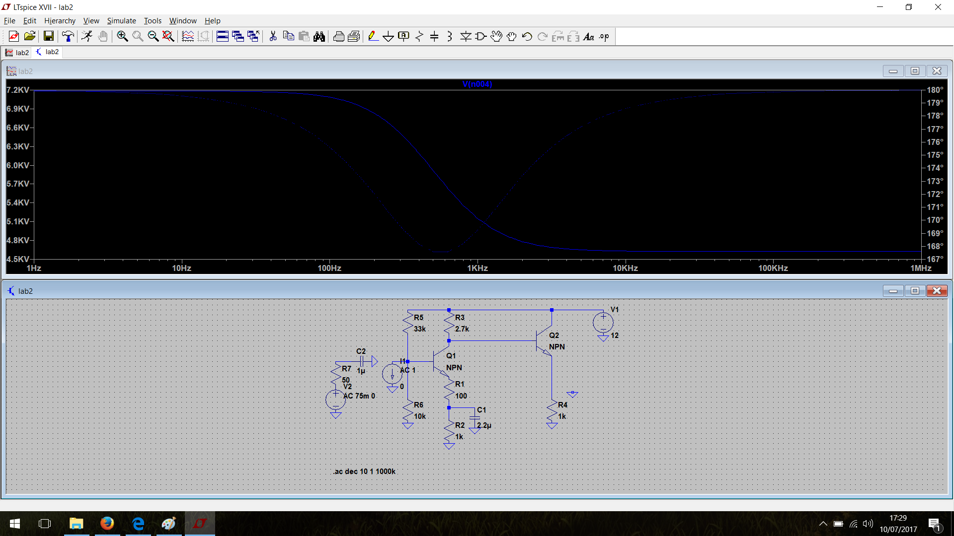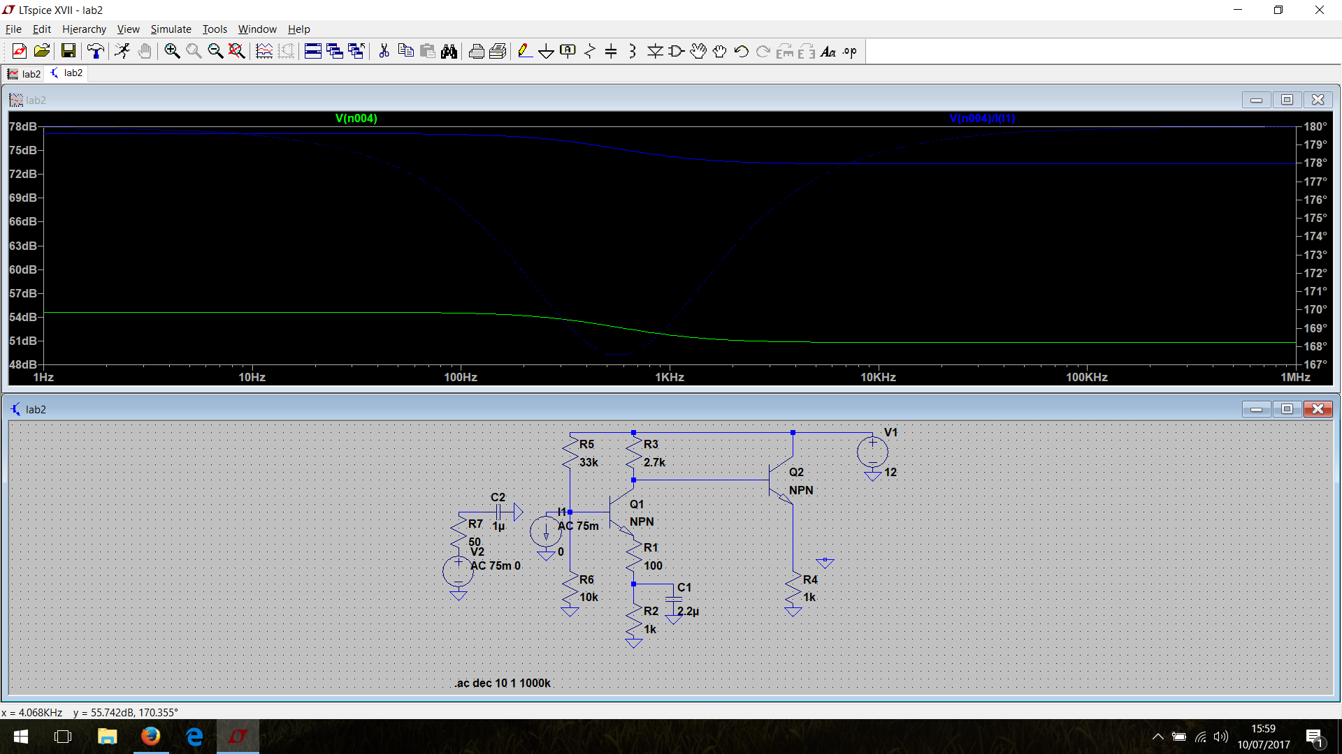 Ad ogni modo l'analisi .AC tiene conto dei generatori indipendenti applicati all'ingresso: essa calcola la risposta in frequenza del circuito (ovvero tutte le correnti e tensioni ai nodi) facendo funzionare il circuito in zona lineare per piccoli segnali, dopo aver linearizzato il circuito intorno al punto di bias (polarizzazione). Il valore dei generatori deve quindi essere scelto con criterio (ad esempio applicare 10 V in alternata in base a un BJT non e' molto sensato).