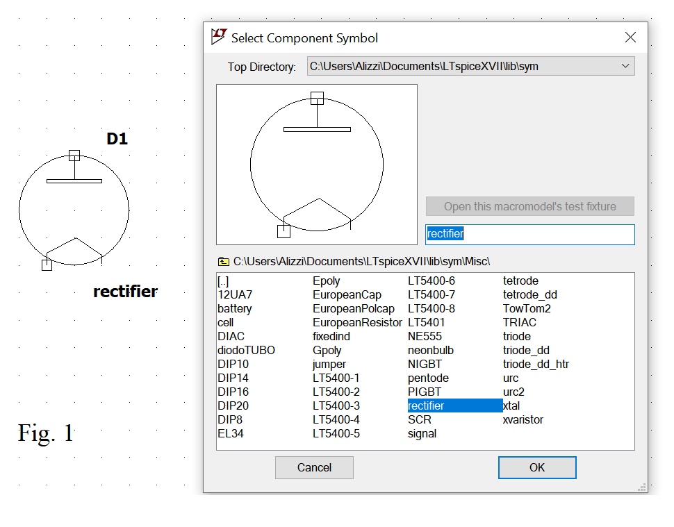 Per inserire triodi,tetrodi e pentodi basta andare nel sottomenu MISC inserire il simbolo,scegliere il componente oppure inserire le specifiche nel disegno. Ma per il diodo (a valvola)? Come si fa?