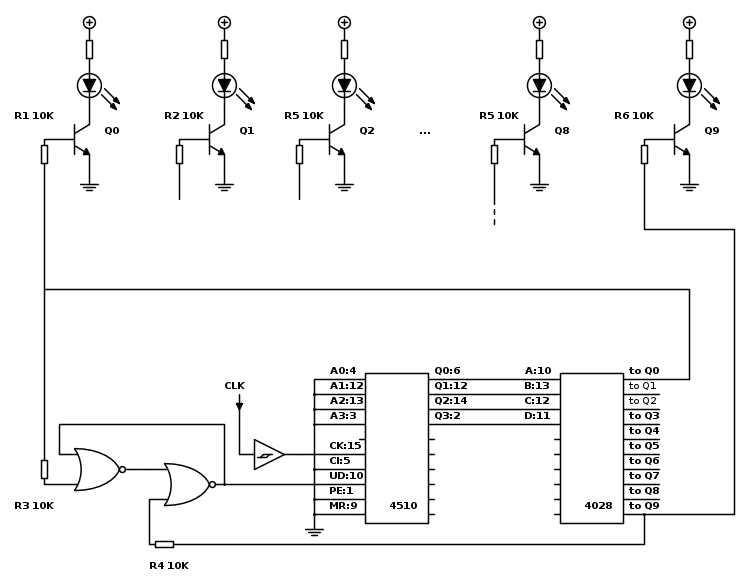 Il 4510 & il 4028 sono tutti e due da 16 pin ciascuno, nello schema ho messo il DIP da 20 per comodità di rappresentazione. Come vedi ho specificato pure il nº di pin. In ogni caso, osserva prima il datasheet per sicurezza