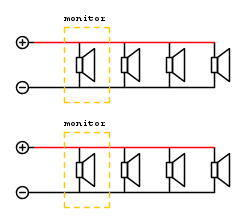 Essendo subito smontata la teoria di un sistema PA 100 V, mi aspettavo che le varie casse (specialmente dopo aver visto il parallelo secco sui morsetti d'uscita) fossero collegate in serie tra loro, questo ipotizzando che i diffusori fossero da 8 ohm.