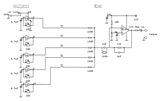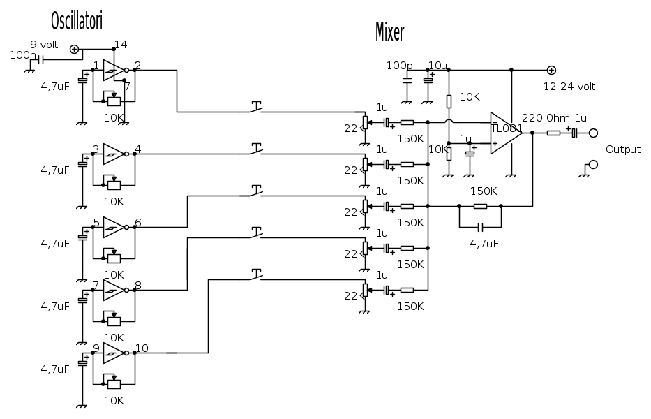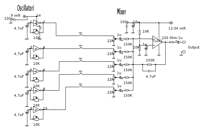 Comunque storiella a parte,è probitivo usare due 40106?cosi arrivo ad una scala di 12 note con 12 oscillatori con altrettanti ingressi al mixer.