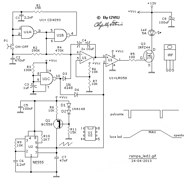 Invece la cosa piu' semplice che mi viene in mente è pensare ad un circuito standard per PWM (magari con un Timer 555), e modificarlo per aggiungere il fade-in e fade-out come da te richiesto.