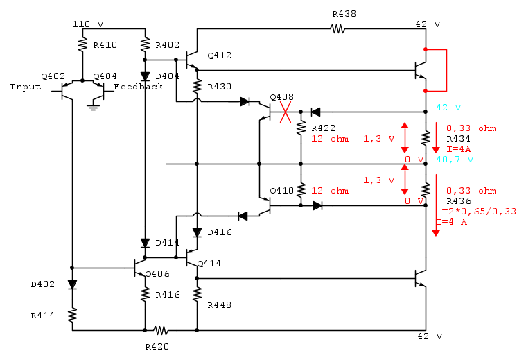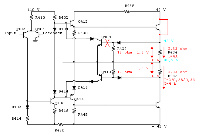 Quando Q408 è presente, la sua giunzione b-e è in parallelo a R422, che viene "clampata" dalla giunzione stessa. Quando rimuovi Q408, l'effetto di clamping cessa di esistere e cessa anche di esistere l'effetto di limitazione di corrente sul finale. Se il finale, senza il limitatore, è mal pilotato da qualcosa che lo manda in saturazione, R422 va in fumo all'istante.