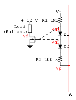 Il gate del mosfet puo' essere connesso (e' da sperimentare la posizione "migliore") a VG1 (anodo di D1) o a Vg2 (anodo di D2, catodo di D1)