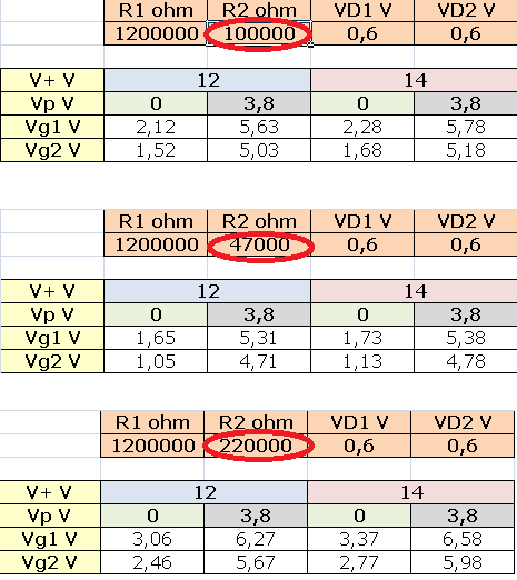 La differenza tra le 3 tabelle e' il valore di R2 (cerchiato di rosso) che varia tra 100.000 ohm, 47,000 ohm e 220.000 ohm