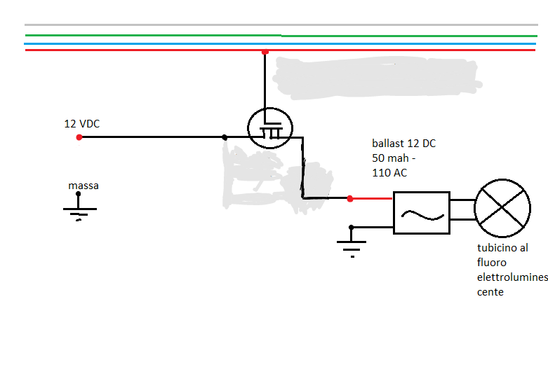 - linea rossa: e' il cavetto da cui ricavi il comando per il mosfet (dale misure che hai fatto puo' assumere due valori di tensione 0V o 3.8 V