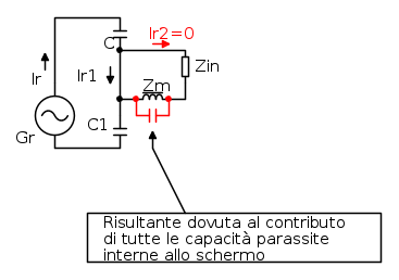 Per quanto riguarda C2, la cui presenza giustificherebbe il ronzio originato da campi elettrici e non magnetici, non mi pare possa essere ricondotta alle capacità parassite tra le varie parti del circuito interne allo schermo: se tutte le parti che hai menzionato (potenziometri del volume e tono, condensatori di accoppiamento, capacità tra calza e centrale del cavo schermato ecc) fossero davvero dentro allo schermo, ovvero se lo schermo fosse davvero perfetto, allora non potrebbero che finire in qualche modo in parallelo a Zm e non verso terra e quindi non potrebbero far scorrere alcuna corrente di ronzio in Zin