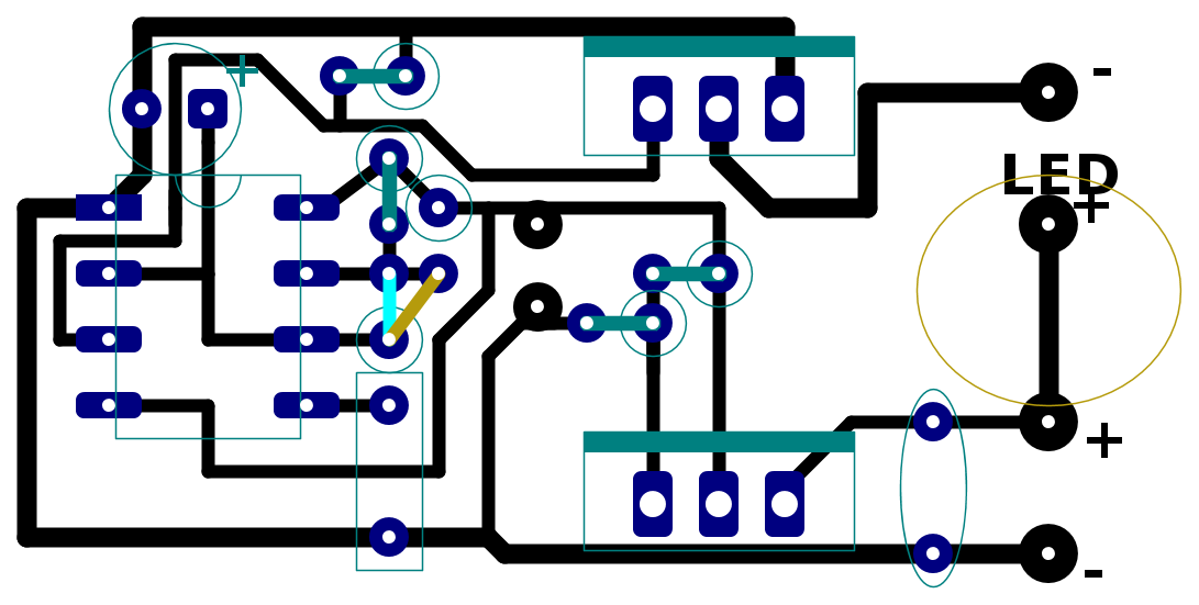 Se quello che ho segnato in azzurro e' il diodo, R2 (marrone) deve essere collegata in parallelo e prendere un terminale di R1 (ma non collegarsi al pin 8 ed al positivo).