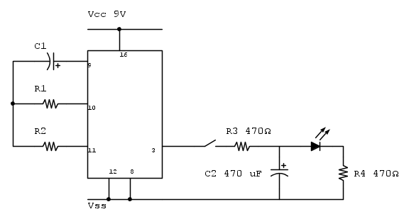 Ho trovato però due formule per calcolare R1 e C1 la prima mi dice che il pin 3 andrà alto dopo R1xC1x1,2x16348 secondi, la seconda è che la frequenza generata è F=1/(R1xC1x2,2).