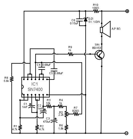 Questo è uno schema classico, che con qualche piccola modifica ho visto 1000 volte quindi sicuramente funziona, ma mi sono sempre chiesto quanto affidabile sia far passare da un altoparlante 9V di corrente continua: non si brucia la bobina?