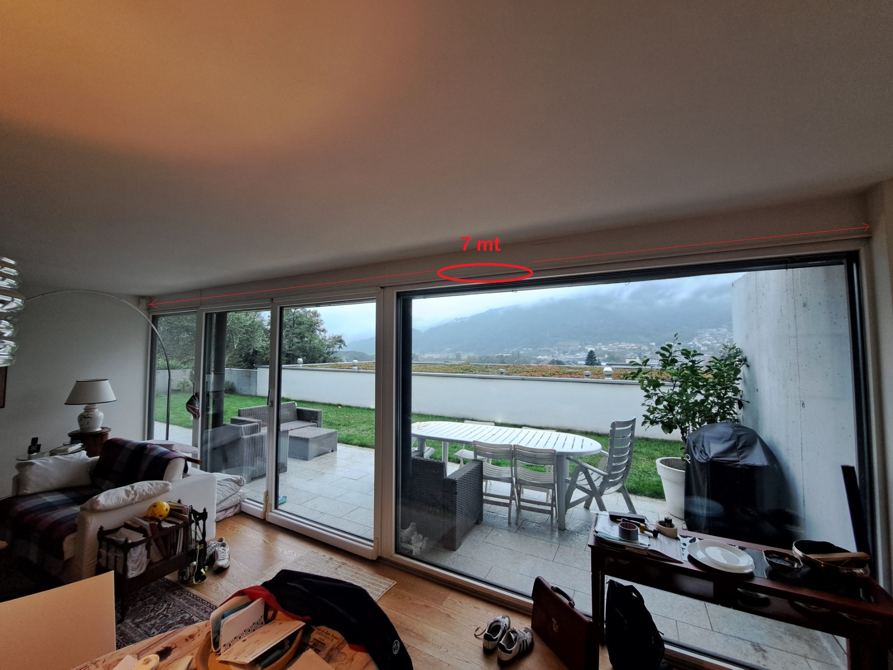 ho un lato soggiorno poco illuminato in prossimità di una vetrata di 7 mt pertanto pensavo di mettere una striscia led sopra il binario delle finestre (cerchiato in rosso), si tratta di una striscia continua di alluminio lunga 7 metri e larga 2 cm.