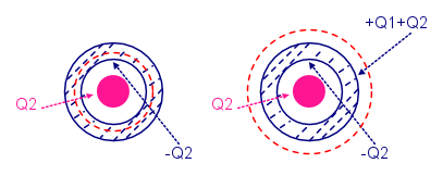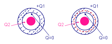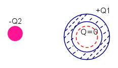 Quando si mette la sferetta dentro il guscio mi sembra che dica che si ha questa situazione della figura a sinistra, ma questo e` impossibile perche' vorrebbe dire avere campo dentro al guscio. Se guardi la superficie gaussiana rossa a destra vedi che questa contiene la carica Q2 e quindi ci dovrebbe essere campo, cosa impossibile