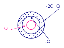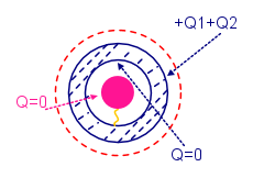 Provo a partire dal principio. Guscio e sfera, ambedue metallici, hanno cariche Q1 e Q2 (Q1 e Q2 possono essere sia positive che negative, uguali o diverse...). I due oggetti sono molto lontani, non interagiscono, le due cariche sono tutte sulle superfici esterne. Dentro al buco non c'e` campo, come si vede dalla superficie gaussiana rossa dato che dentro non c'e` carica.
