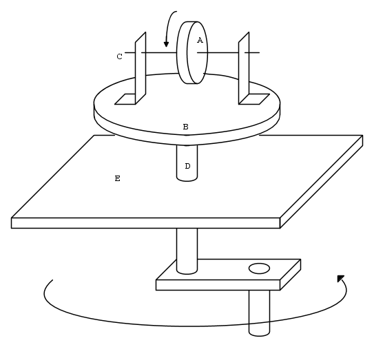 In effetti ho supposto che sia il volano che il piatto abbiano una massa, quindi, in relazione alla loro forma, anche un momento d'inerzia e che l'energia spesa girando la manovella si converta in energia rotazionale di entrambi perché entrambi si mettono a ruotare con una certa velocità rispetto all'asse del piatto, indipendentemente dalla velocità di rotazione del volano attorno al proprio asse.