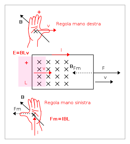 Il verso della corrente nella slide è corretto. Infatti affinché il movimento indicato dalla velocità v produca tensione elettrica nella spira, occorre che il solo lato sinistro sia immerso nel campo magnetico di induzione B. Quindi è su quel lato che vanno applicate, ad esempio, le regole del palmo della mano destra, per la forza elettromotrice indotta, o del palmo della mano sinistra, per la forza magnetica sviluppata Fm che si oppone alla forza applicata F, non su quello destro, come probabilmente feci io che è al di fuori del campo!
