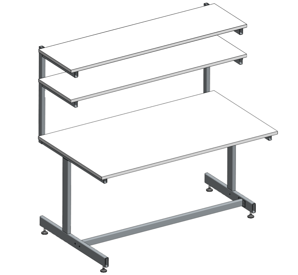 Il piano di lavoro di ogni banco è 1600x900mm mentre le mensole sono 1600x460mm.