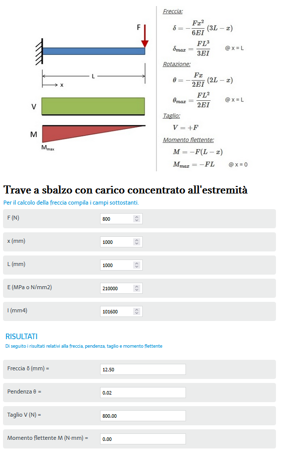 Però Bruno valuta bene quello che ti hanno detto in precedenza, ovvero che la freccia così calcolata è indicativamente corretta a patto che all'altra estremità la trave abbia come vincolo un incastro ideale. Nel tuo caso, ma più in generale in ogni caso questo non è mai vero e così ti tirerai dietro anche le flessioni legate sia alla sezione verticale che alla sezione orizzontale appoggiata al terreno.