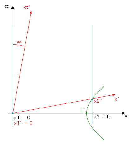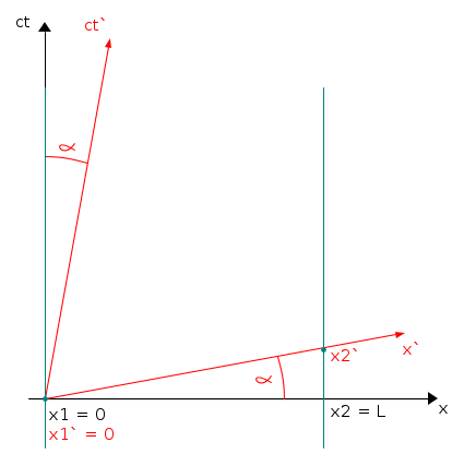 In nero, nel diagramma sopra, sono rappresentati gli assi del sistema non accentato, quello in cui la barra è in quiete. Sull'asse dei tempi c'è il prodotto