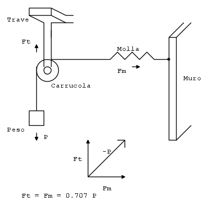 Nella disposizione di un peso disposto su una carrucola fissata ad un trave sporgente che però è anche sostenuto da una molla fissata ad un muro in modo perpendicolare alla trave, il peso che deve sostenere la trave è 0.707 volte il peso ?
