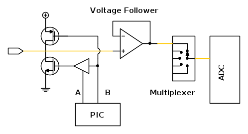 - se entrambi i MOS si comportano come circuiti aperti (ottenibile con una particolare configurazione di A e B) allora il collegamento trasporta l'informazione di tensione all'ADC.