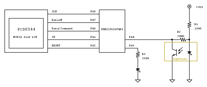 Il valore letto dal ADC sul TCRT500 viene riportato su un display LCD PCD8544 via SPI.