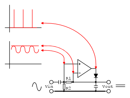 Di conseguenza la tensione sull'ingresso invertente è continua e di valore pari Vout, mentre invece la tensione sull'ingresso non invertente è costituita da una componente continua pari a Vout-VR1,