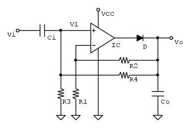 dove con Vpk indichiamo il valore di picco della tensione alternata sinusoidale di ingresso ed essendo V1 derivato dalla tensione di uscita tramite il partitore R4-R3, possiamo scrivere