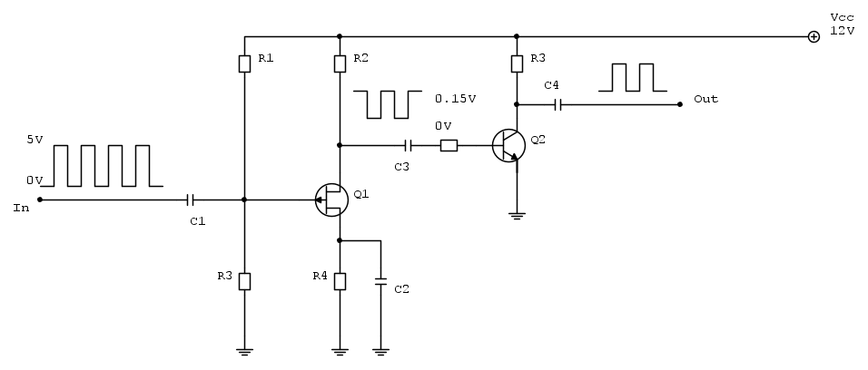 Il primo Q1 dovrebbe attenuare il segnale fino a 150 mV. Quindi l'uscita (dal JFET) deve avere un guadagno in tensione A di -Vout/Vin = 0.15/5 = 0.03. e fin qui ci sono (nulla di diverso rispetto agli A.O.).