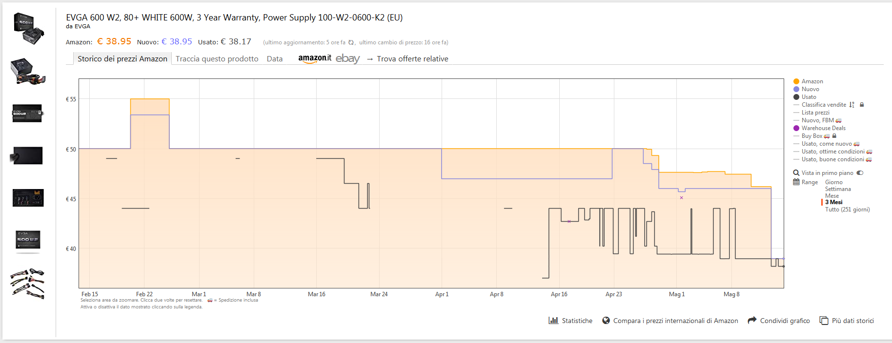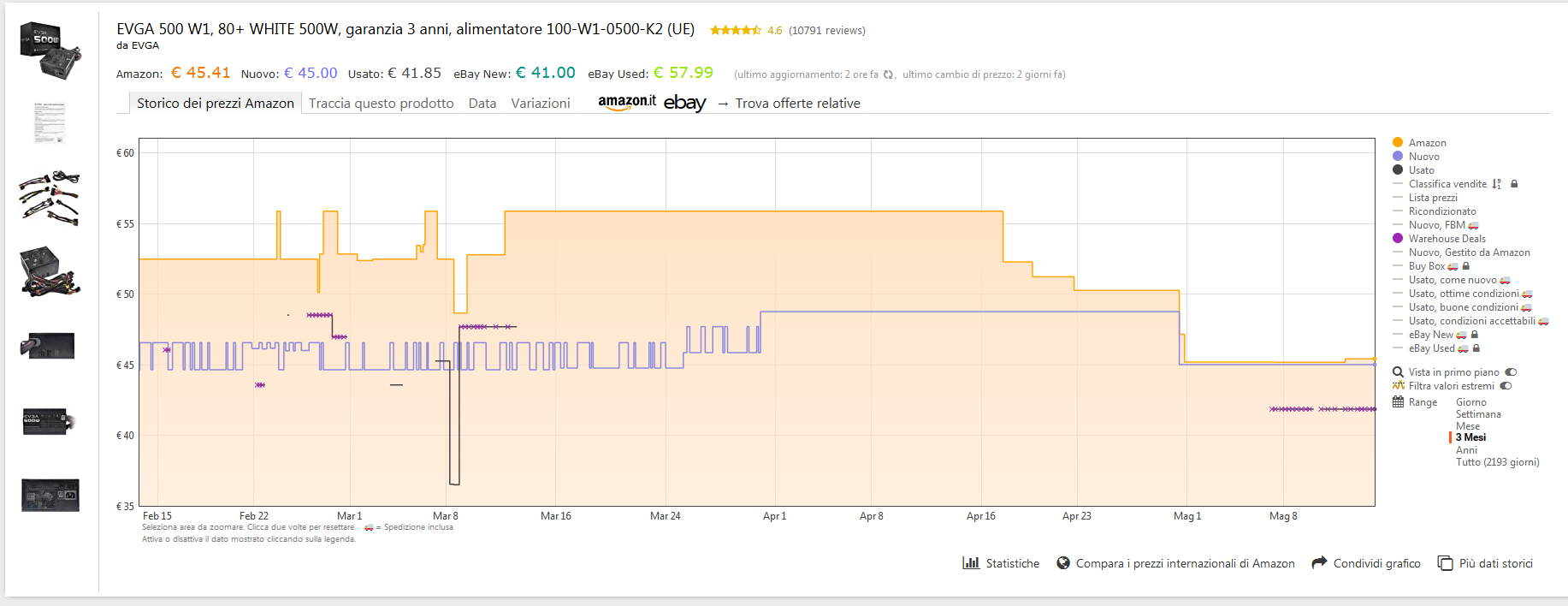 Utilizzo Keepa (da notare che il grafico appare automaticamente all'interno della pagina di Amazon visitata) quando non ho fretta di acquistare un articolo e, vedendo che periodicamente viene messo in offerta per pochissimi giorni, aspetto l'occasione propizia. E' anche possibile essere avvertiti di quando cambia il prezzo, definendo prima la percentuale di variazione (però mi sembra sia una funzione a pagamento, una volta superati tre articoli da tenere sotto controllo).