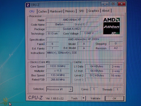 Niente di che, il PC riconosce come processore un barton 2000+ lo FSB effettivamente è a 266Mhz ma il moltiplicatore non è variato, è rimasto a x11,5 ecco la schermata: