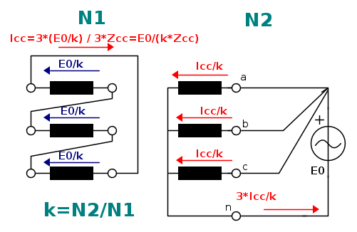 admin ha scritto:Nel caso specifico significa che se applichi una terna di sequenza zero al lato Yn, ognuno dei trasformatori monofase che compongono il trifase è in condizione di cortocircuito, in quanto negli avvolgimenti secondari sono indotte tre tensioni in fase che, con il collegamento a triangolo, sono in serie tra loro e si sommano aritmeticamente: la corrente che circola nel triangolo è allora proprio la corrente di cortocircuito di ogni singolo trasformatore monofase.