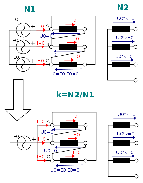 All'avvolgimento della prima colonna che fa parte del collegamento a stella, applichiamo una tensione E0.