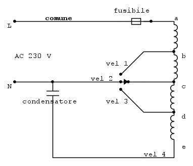 Sempre dal punto " L " e nel punto " N " devo trovare continuità nelle tre posizioni del commutatore della velocità più o meno alta a seconda della posizione.