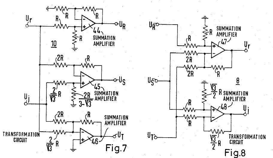 Ho fatto una cosa, sono andato a guardarmi i brevetti americani, come mi ha consiglaito Meiko e ho trovato tanti spunti interessanti, poi capire con precisione le cose descritte, non è facile, però ho trovato delle belle cose, tra cui il brevetto US3824437 che descrive il "metodo per controllare macchine asincrone"di Felix Blaschke. Interamente realizzato con tecnologia analogica, mostra come si può realizzare sia la trasformata che l'anti-trasformata di Clarke utilizzando dei semplici operazionali. La Fig.8 è un circuit tipo Scott che fa la trasformata di Clarke, mentre in Fig.7 il circuito che fa l'anti-trasformata.