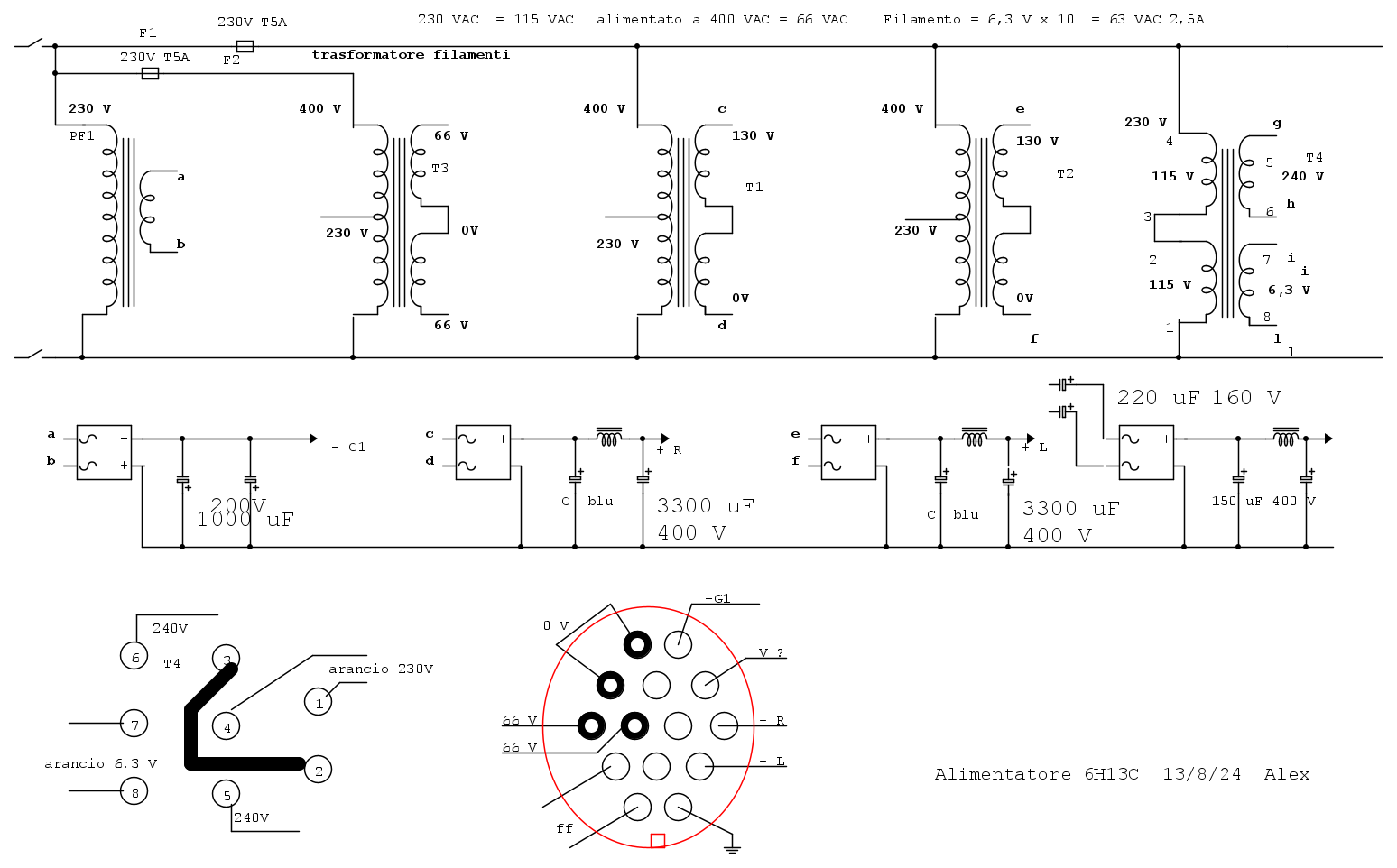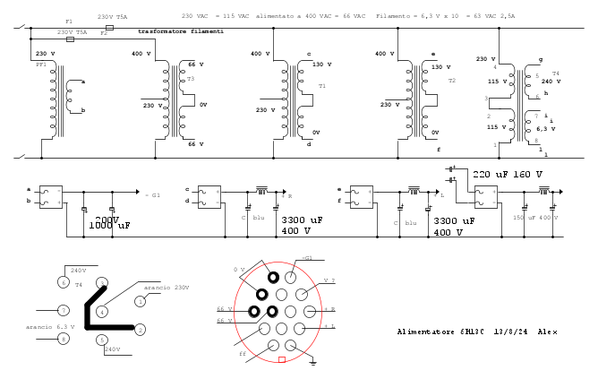I filamenti delle valvole sono messi in serie, 2 canali separati, 66V 2,5 A.