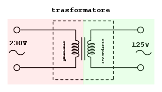 Esatto, il trasformatore ha un avvolgimento primario connesso alla tensione di rete elettrica 230 V 50 Hz, ed un avvolgimento secondario che fornisce l'uscita con il valore di tensione necessario, se non ricordo male in questo caso di 125 V, ovviamente la potenza espressa in voltampere (VA) del trasformatore dovrà essere uguale o superiore a quella richiesta dal dispositivo che dovrà essere alimentato. Nel trasformatore i due circuiti elettrici ovvero quello primario e quello secondario sono magneticamente accoppiati attraverso un nucleo, ma elettricamente separati, si hanno infatti due conduttori di alimentazione per il circuito primario , e due conduttori di collegamento per il circuito secondario,pertanto tra i due circuiti c'è una sorta di separazione elettrica.