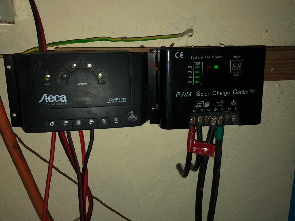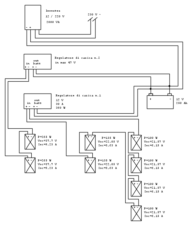 1. non capisco come diavolo hanno collegato i due regolatori di carica, sembra che alimentino le batterie e poi in parallelo anche l'inverter (questo collegamento mi lascia molti dubbi, direi che sarebbe decisamente meglio usare l'uscita dedicata dei regolatori così ho il controllo sulla scarica, così non saprei dire se funziona, ma credo proprio di no). Sicuramente sarebbe preferibile usare un unico regolatore di carica, ma in caso estremo si potrebbero parallelare le uscite verso il carico dei regolatori e collegarle direttamente all'inverter;
