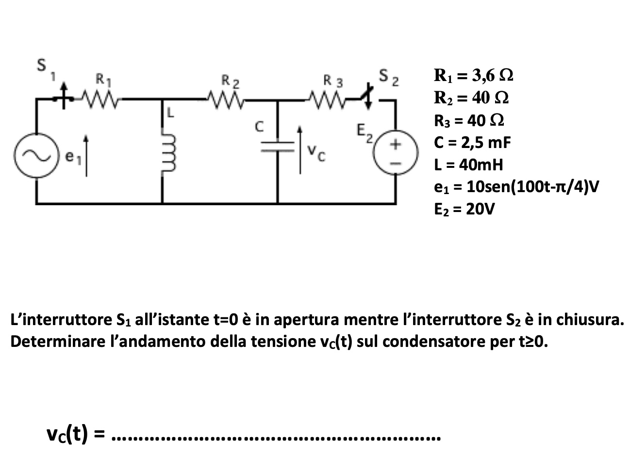 Poi dovresti calcolare la corrente in L e la tensione ai capi di C sempre per t = 0.