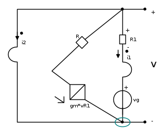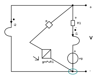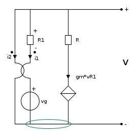 -i_1-g_mV_{R1}-i_2=0 che per la relazione del trasformatore i_1=-\frac{1}{2}i_2 si ha che i_1=0 e quindi anche i_2=0